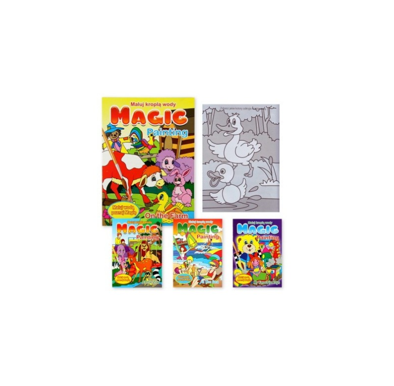 Kolorowanka „Maluj wodą – Magic Painting” to wyjątkowa propozycja dla najmłodszych, która pozwala tworzyć kolorowe obrazki bez użycia farb czy kredek. Wystarczy odrobina wody i pędzelek, aby na pozór czarno-białe ilustracje ożyły pięknymi barwami!