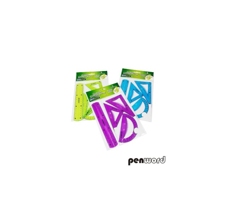 W skład zestawu wchodzą 4 podstawowe elementy o długości 15 cm, niezbędne do nauki i pracy z geometrią 📊 Komplet dostępny jest w trzech atrakcyjnych kolorach: zielonym 💚, niebieskim 💙 oraz fioletowym 💜, co pozwala na dopasowanie do indywidualnych preferencji